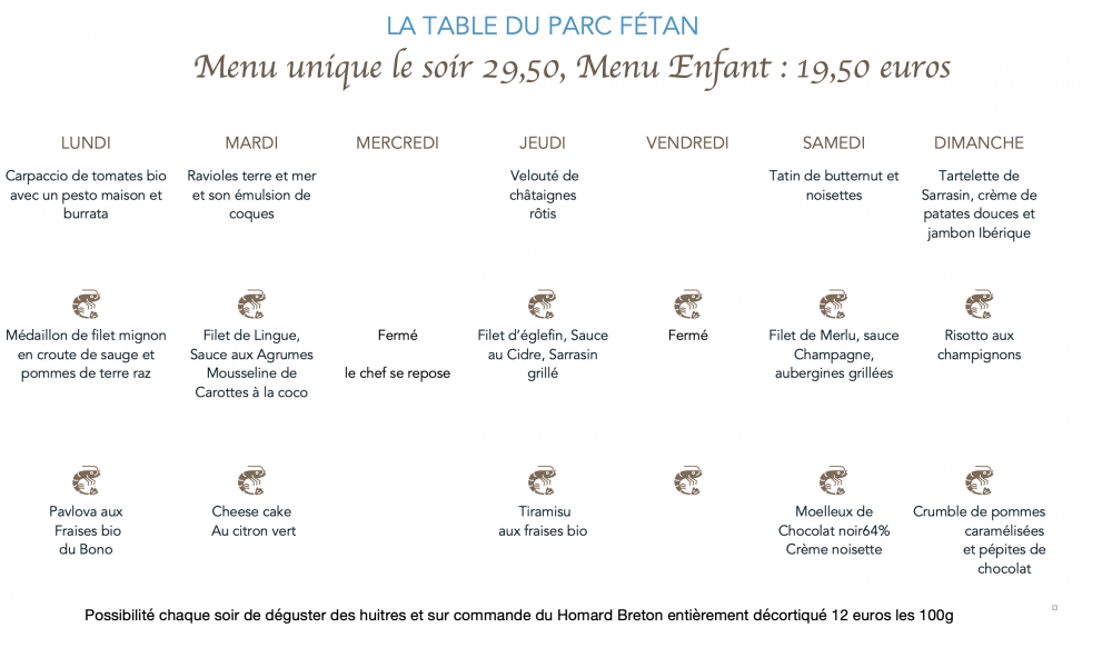 Le chef de La Table du Parc Fétan vous propose chaque soir un menu unique et une suggestion, autour d’une cuisine surprenante, raffinée, équilibrée et variée. Le chef invite à une véritable dégustation des saveurs de nos côtes. Les menus élaborés par le chef sont composés essentiellement à base de poisson, à l’exception du dimanche et du lundi.