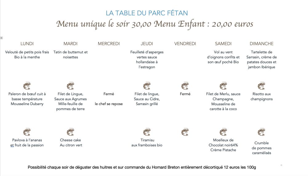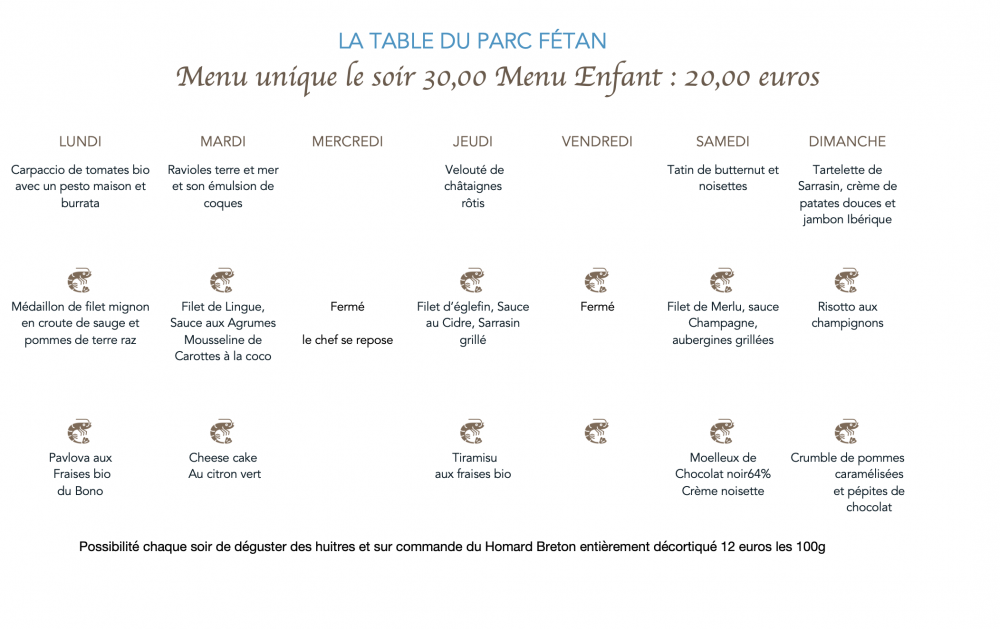 Le chef de La Table du Parc Fétan vous propose chaque soir un menu unique au tarif de 30 euros par personne (entrée, plat et dessert) autour d’une cuisine surprenante, raffinée, équilibrée et variée. Le chef invite à une véritable dégustation des saveurs de nos côtes. Les menus élaborés par le chef sont composés essentiellement à base de poisson, à l’exception du dimanche et du lundi.